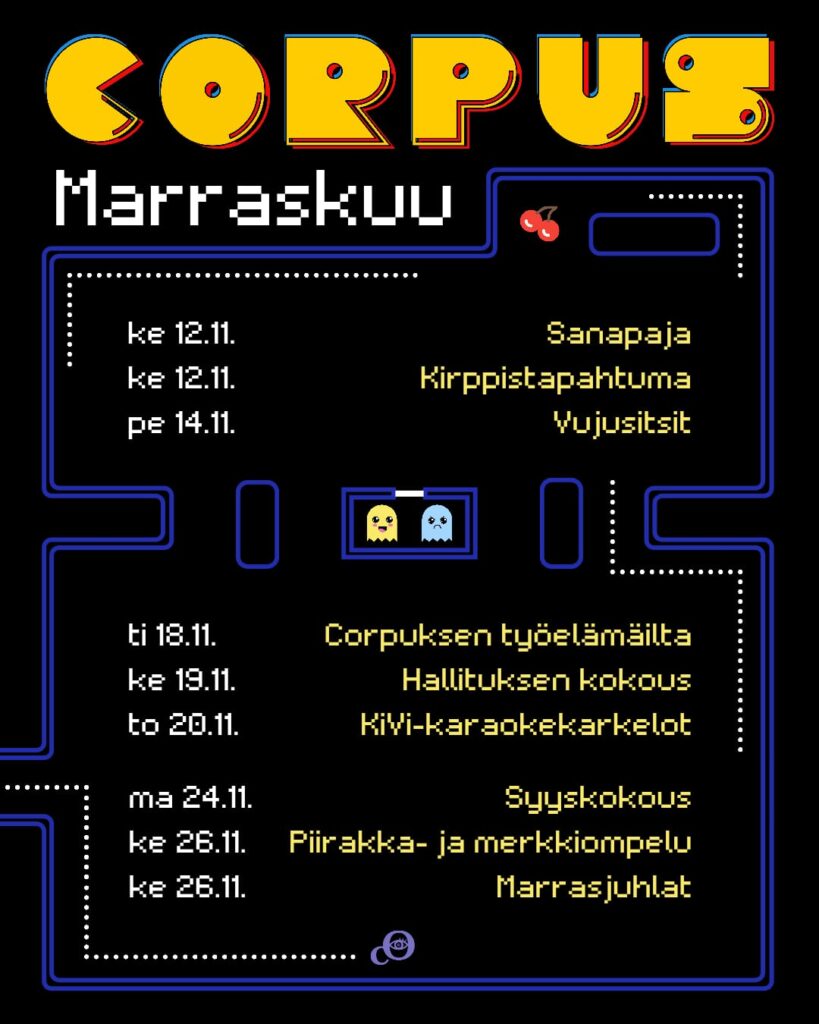 Olet saapunut Corpus ry:n nettisivuille. Corpus ry, tuttavallisemmin Corpus, on Jyväskylän yliopiston kirjallisuuden, museologian, taidehistorian ja taidekasvatuksen opiskelijoiden ainejärjestö. Lisäksi olemme KUOMAn (kulttuuriympäristön tutkimuksen maisteriohjelman) ainejärjestö ja yhdessä Sane ry:n kanssa äidinkielenopettajaopiskelijoiden ainejärjestö. Oppiaineemme kuuluvat Musiikin, taiteen ja kulttuurin tutkimuksen laitoksen piiriin yhdessä musiikkitieteen ja musiikkikasvatuksen kanssa.